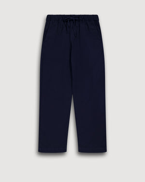 Pantalon garçon. Ceinture élastiquée et cordon de serrage à la taille. Poches biais sur le devant et poches passepoilées au dos.