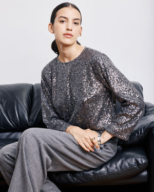 Top femme ample et court à encolure ronde. Emmanchures tombantes. Goutte au dos avec bouton de fermeture et petites fentes latérales.